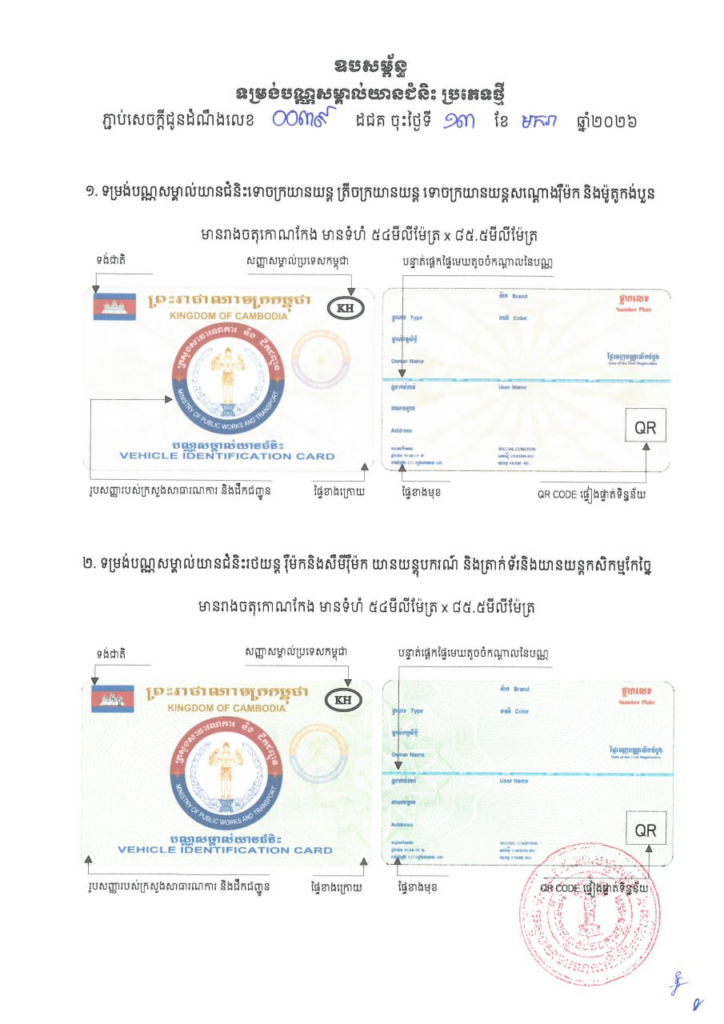 បើតាម​សេចក្តីជូនដំណឹង​របស់អគ្គនាយកដ្ឋានដឹកជញ្ជូនផ្លូវគោកនៃ​ក្រសួងសាធារណការនិងដឹកជញ្ជូន បណ្ណ​សម្គាល់​យានជំនិះប្រភេទថ្មីនេះ នឹងត្រូវដាក់ឱ្យប្រើ​ប្រាស់ចាប់ពីថ្ងៃទី១៥ ខែមករា ឆ្នាំ២០២៦ នេះតទៅ៕